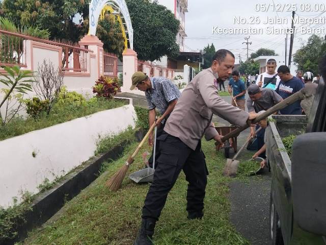 Pematangsiantar, Ruangpers.com – Polsek Sianțar Barat – Polres Pematangsiantar melalui Bhabinkamtibmas, Aiptu Deddy Syam dan Aiptu R.P Damanik, mengikuti kegiatan gotong royong bersama masyarakat, di Jalan Merpati, Kelurahan Sipinggol – pinggol, Kecamatan Siantar Barat, Kota Pematangsianțar, pada Jumat (5/12/2025) pagi, pukul : 08.00 WIB.