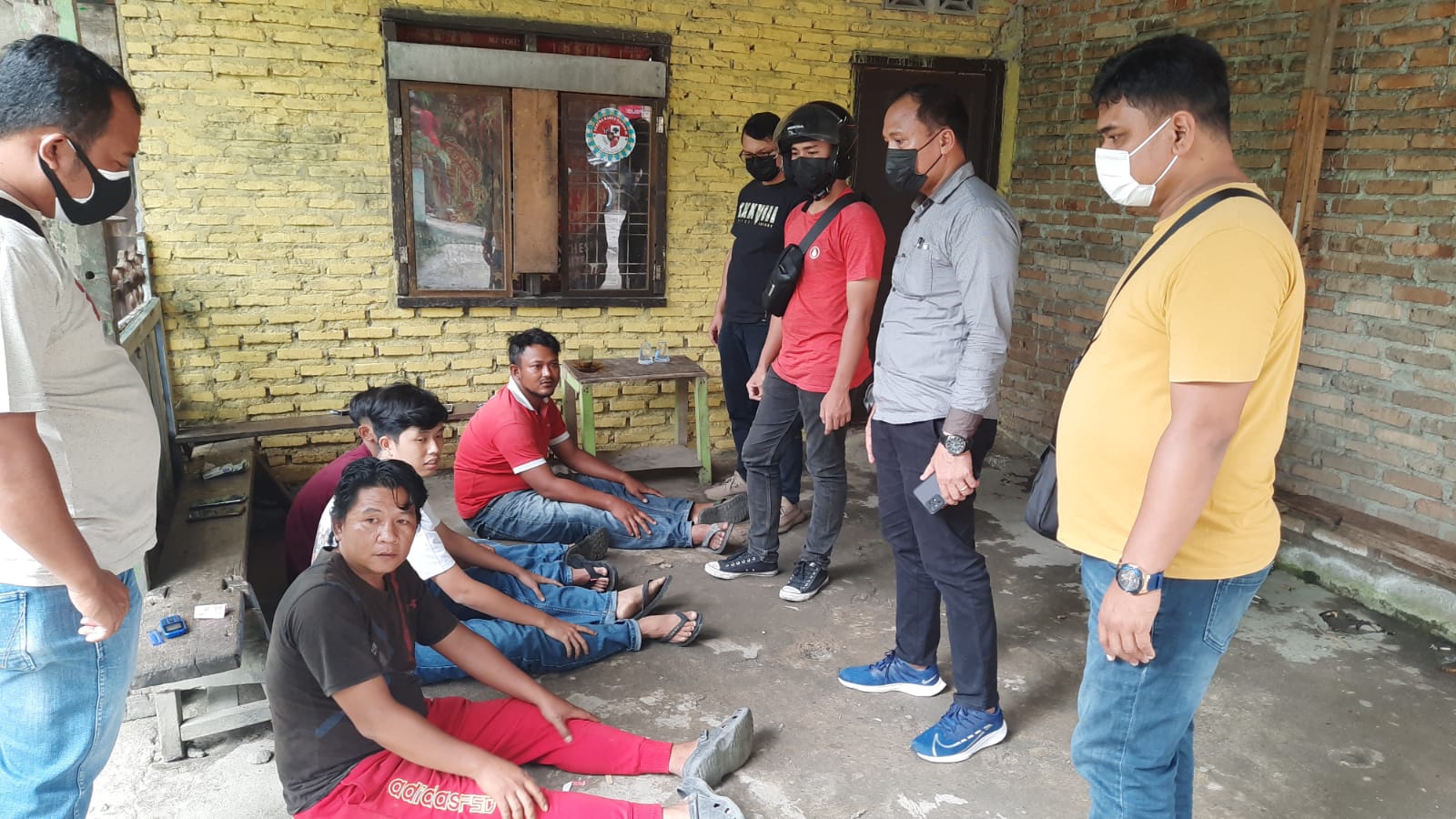 Tiba di lokasi, ditemukan 7 (tujuh) orang lagi duduk-duduk  di teras bengkel dan dilakukan penggeledahan badan terhadap mereka, namun tidak ditemukan barang bukti narkoba apapun.