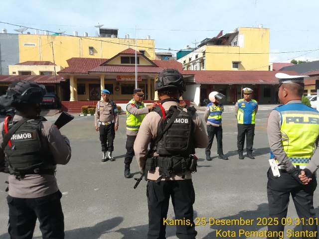 Pematangsiantar, Ruangpers.com – Polres Pematangsiantar menggelar patroli skala besar, mengecek ibadah Perayaan Natal Tahun 2025, di Gereja yang ada di wilayah hukum Polres Pematangsiantar, pada Kamis (25/12/2025) pagi, pukul : 09.00 WIB.
