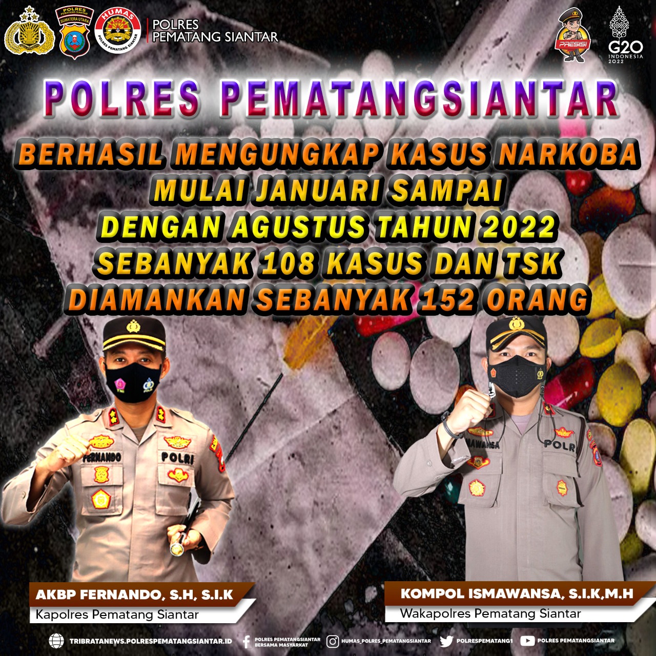 Dari pengungkapan 108 kasus narkoba hasil kinerja Sat Resnarkoba Polres Pematang Siantar untuk bulan Januari 12 kasus, Februari 10 kasus, Maret 18 kasus, April 14 kasus, Mei 11 kasus, Juni 17 kasus, Juli 14 kasus dan Agustus 12 kasus.