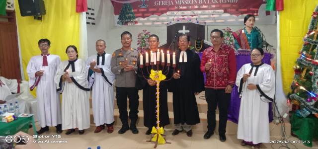 Pematangsiantar, Ruangpers.com – Kapolsek Siantar Martoba, AKP Martua Manik SH, MH, mewakili Kapolres Pematangsiantar, AKBP Sah Udur T.M. Sitinjak SH, SIK, MH, menghadiri undangan Perayaan Natal Gereja Mission Batak (GMB) se-Siantar Simalungun, di GMB Jalan Gurilla, Kelurahan Gurilla, Kecamatan Sianțar Sitalasari, Kota Pematangsiantar, pada Sabtu (6/12/2025) siang, pukul 14.00 WIB.