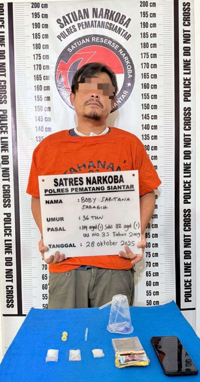 Pematangsiantar, Ruangpers.com – Satuan Reserse Narkoba Polres Pematangsiantar berhasil menangkap seorang laki – laki asal Kabupaten Simalungun lantaran memiliki narkotika jenis sabu dengan berat brutto 4,47 gram, di dalam sebuah kamar Hotel Alexander Graha, Jalan Jalan Saribu Dolok, Kelurahan Tong Marimbun, Kecamatan Siantar Marimbun, Kota Pematangsiantar, pada Selasa (28/10/2025) siang, sekira pukul 13.40 WIB.