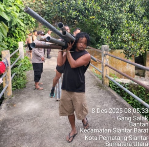 Pematangsiantar, Ruangpers.com – Tindaklanjuti laporan masyarakat di Call Center 110, Polres Pematangsiantar melalui personil Polseķ Siantar Barat, gerak cepat amankan seorang terduga pelaku pencurian besi jembatan yang terletak di Jalan Bila Kaki, Gang Setia Kawan Kampung Banjar, Kelurahan Banjar, Kecamatan Siantar Barat, Kota Pematangsiantar, pada Senin (8/12/2025) pagi, sekira pukul 08.30 WIB.