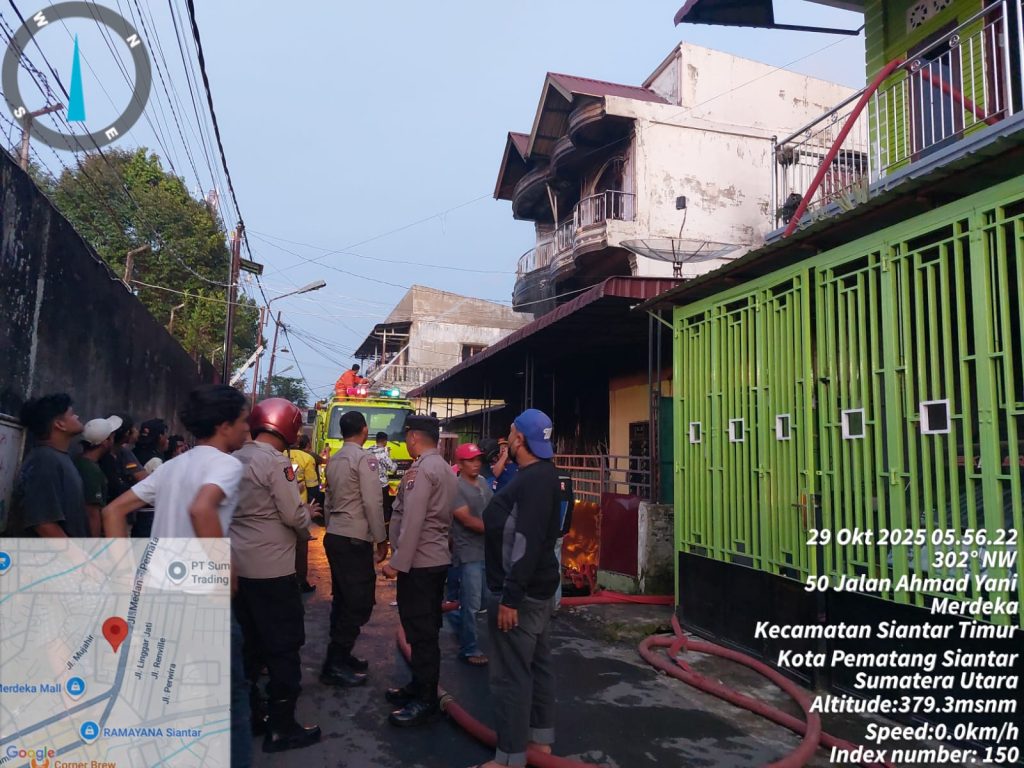 Pematangsiantar, Ruangpers.com – Polres Pematangsianțar melalui personil piket SPKT dan Satfung, beserta personil Polsek Sianțar Timur, melakukan pengecekan Tempat Kejadian Perkara (TKP) kebakaran satu unit rumah warga, di Jalan Ahmad Yani, Gang Udang, Kelurahan Pardomuan, Kecamatan Siantar Timur, Kota Pematangsiantar, pada Rabu (29/10/2025) subuh, sekira pukul 04.00 WIB.