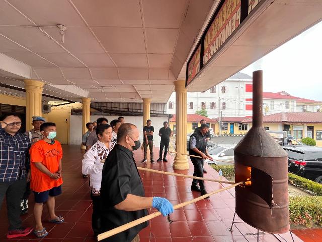 “Dari tersangka disita jumlah keseluruhan ganja berat brutto 31,29 gram dan berat netto 22,95 gram. Kemudian disisihkan 10 gram untuk pemeriksaan ke Laboratorium Forensik (Labfor) Polda Sumut, sedangkan sisanya 12,95 gram dimusnahkan hari ini,” jelasnya.