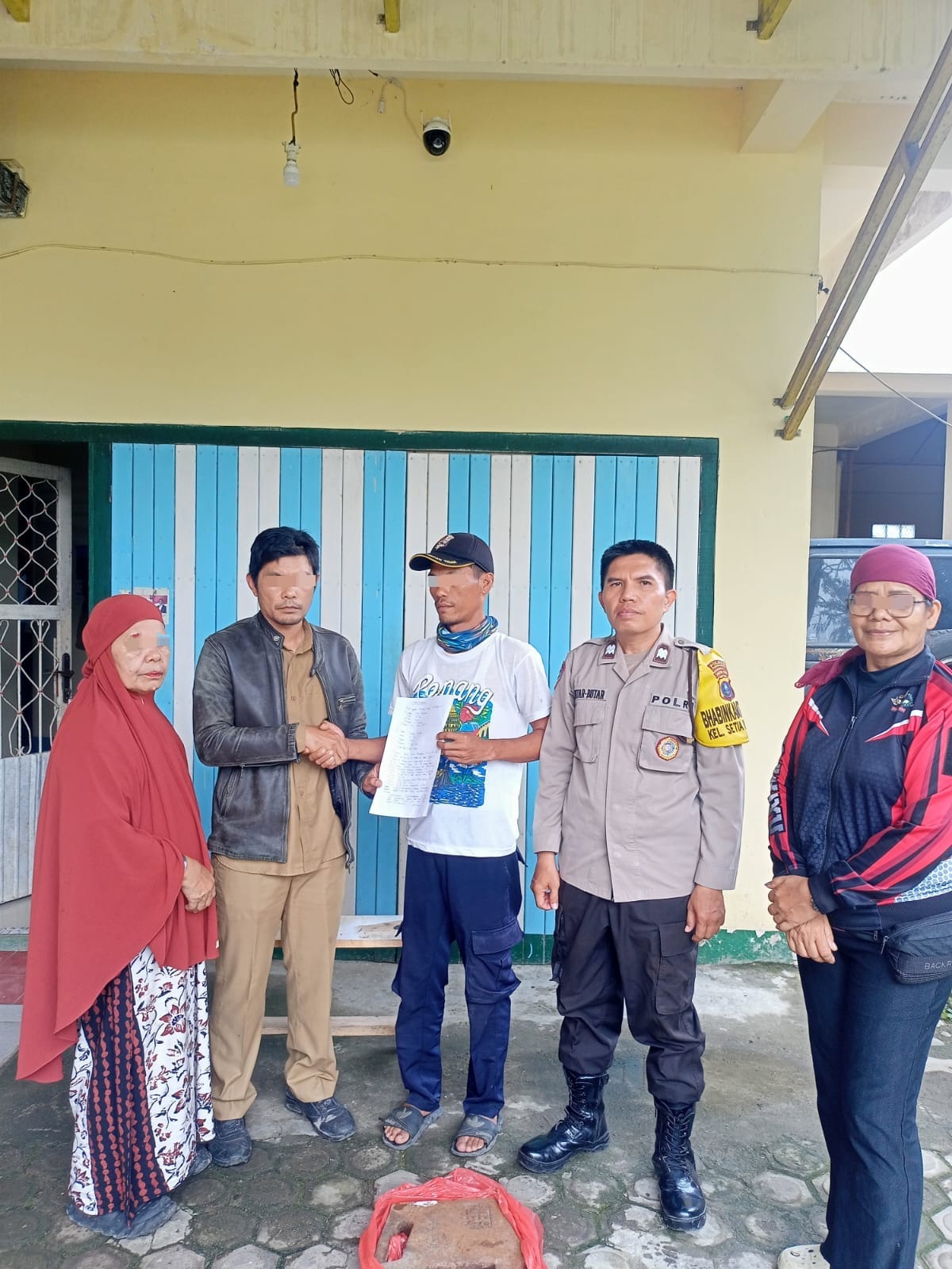 Selanjutnya Bhabinkamtibmas Kelurahan Setia Negara, AIPTU Januar Butar Butar melakukan mediasi terhadap kedua belah pihak yang hasilnya kedua belah pihak sepakat selesaikan dugaan pencurian besi bulat tersebut secara kekeluargaan karena pihak pertama DK mengakui perbuatannya, meminta maaf kepada pihak kedua dan mengembalikan plat besi bulat tersebut.