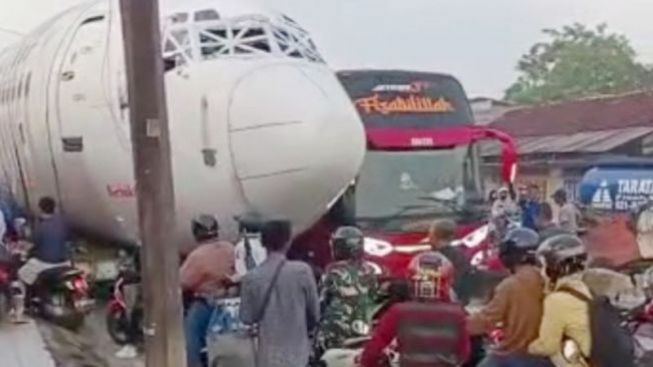 Bogor, Ruangpres.com – Sebuah video yang memperlihatkan badan pesawat membuat macet di Jalan Parung Bogor viral. Bodi pesawat yang diangkut container itu bahkan tampak melebihi separuh badan jalan. Di tengah aktivitas lalu lintas yang padat, jelas bangkai pesawat itu bikin macet parah.